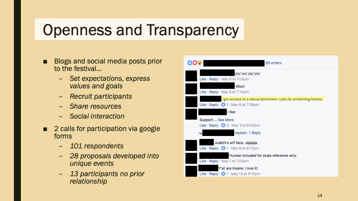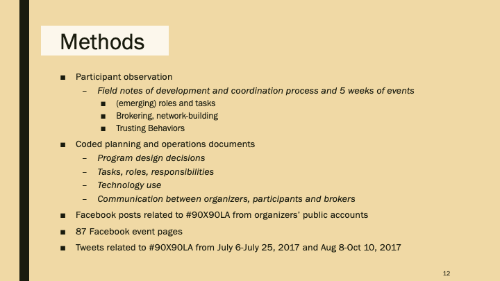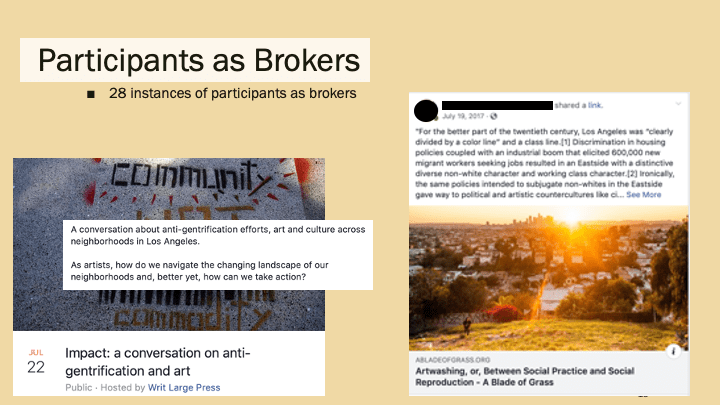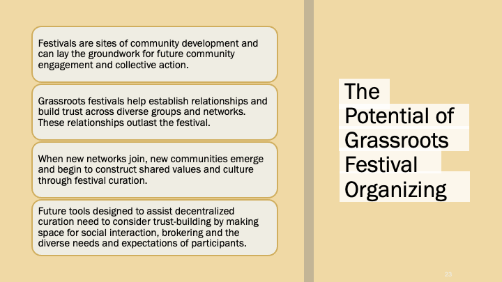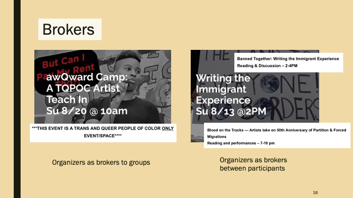 Abstract: In this case study, we examine how organizers of a grassroots literary and cultural festival, #90X90LA, built trust across networks in a decen-tralized curatorial process. Organizers with backgrounds in arts andcommunity organizing used online organizing tactics and tools toconnect writers from dierent neighborhoods, marginalized identity groups and cultural organizations. We observe that the use of social media helped bring openness and transparency to the planning process, inviting broader participation and creating space for social interactions, thus facilitating trust. Brokers played a pivotal role in connecting different networks online and off and fostered collaboration and relationship building. However, in some cases brokering was not enough to establish trust; organizers had to make extra efforts to adapt to groups’ cultural and communication norms and make special accommodations to increase inclusivity.